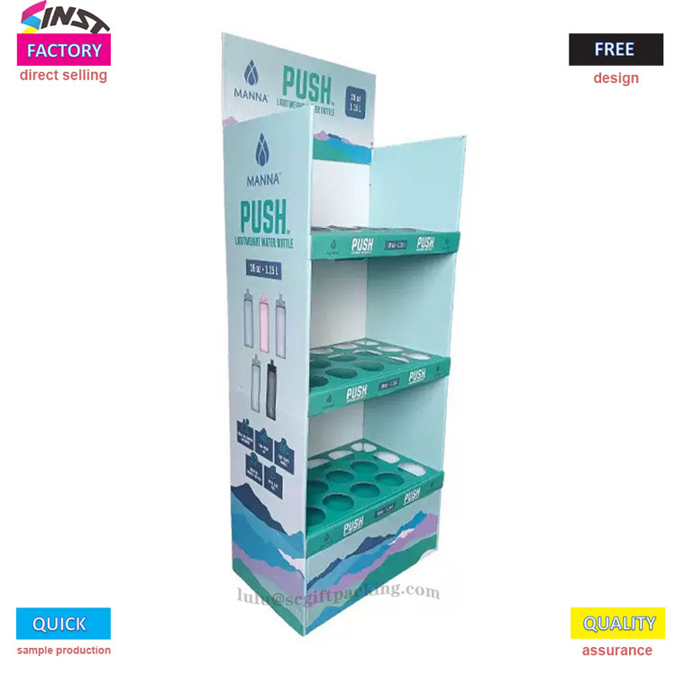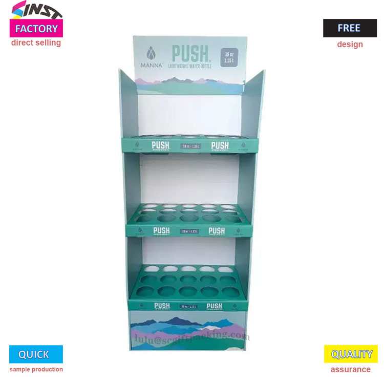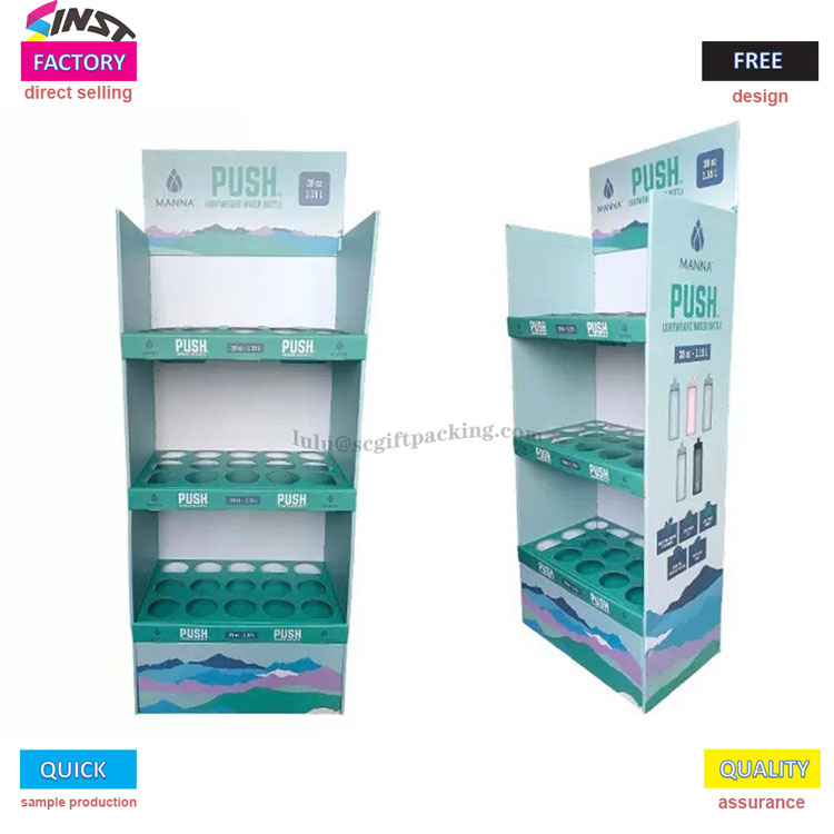 Ez a kartonkarton-padló-állvány a Supermarke vizes palackhoz háromrétegű rácsszerkezet-kialakítással rendelkezik, minden rétegen kör alakú hornyokkal, hogy pontosan tartsák a vizes palackot és megakadályozzák a gördülést. A márka logója a tetejére nyomtatható, és a termékgrafika oldalra nyomtatható, egyszerű és csúcsminőségű. Elsősorban olyan termékek megjelenítésére, mint például vizes palackok, csészék, tej teáscsészék, Thermos csészék stb.