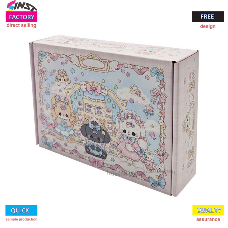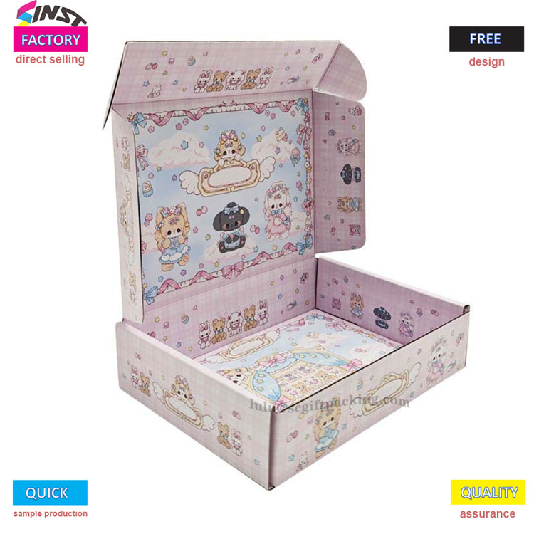 A ruhák színes hullámosított papírreszállító doboza édes, rózsaszín színes sémával rendelkezik, világoskék díszítéssel. A dobozt rajzfilm elemekkel, például virágfüzérekkel, kis állatokkal, íjakkal, felhőkkel és szívekkel töltik meg, álmodozó és aranyos stílust hozva létre. A megjelenéstől a szolgáltatásig teljes mértékben felhatalmazza a ruházati csomagolást és javítja a márka vonzerejét.