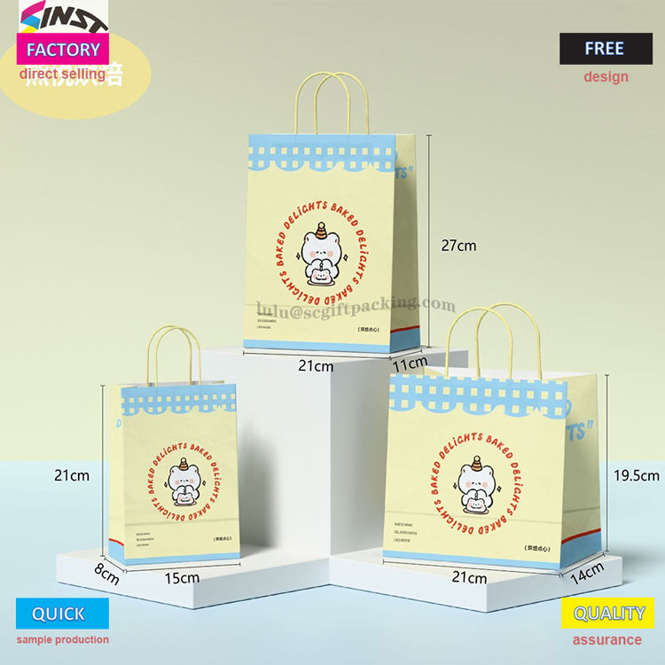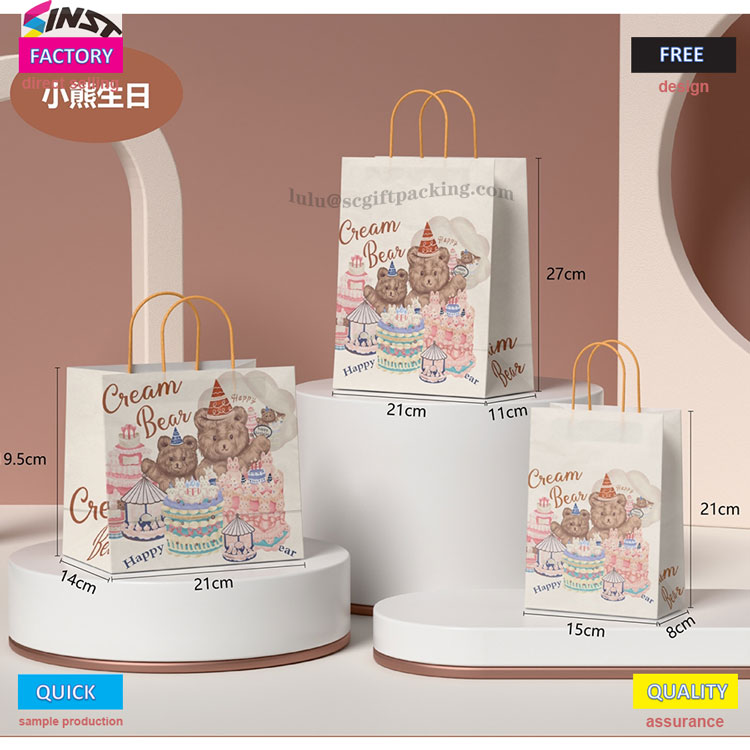 Nemrég,A Sinst Packaging Company elindított egy ajándéktáskátA "Bear Birthday" témájával. A táskát kézzel rajzolt rajzfilmmedve és süteménymintákkal nyomtatják, párosítva egy meleg sárga fogantyú kötéllel, amely nemcsak megtartja a papírzacskó környezetbarát textúráját, hanem a születésnapi légkört is élénk színeken keresztül továbbítja. Ez a táska különféle ajándékokhoz, például tojás süteményekhez, játékokhoz, ajándékdobozokhoz stb., Akár családi összejövetel, akár kiskereskedelmi üzlet, az alapvető csomagolási igények kielégítésére képes.