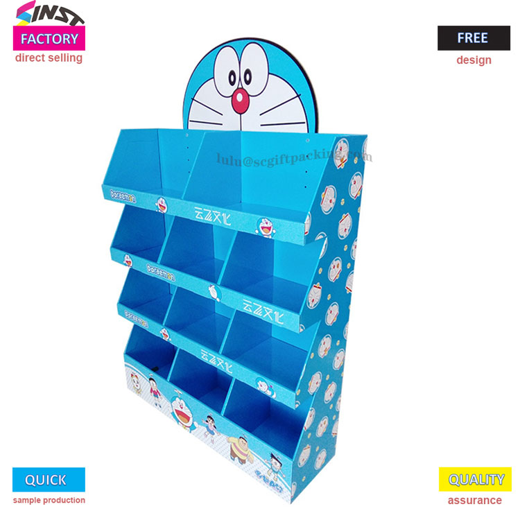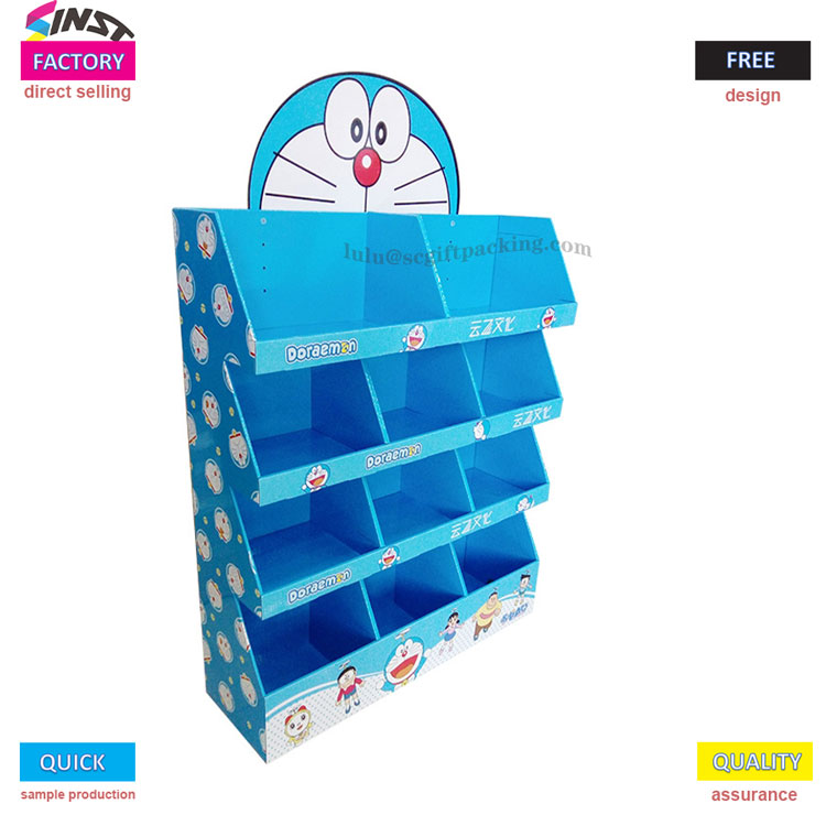 Ez a bevásárlóközpont keksz kartonkijelző állványa tökéletes szupermarketekhez, kisboltokhoz vagy pékségekhez, fényes kék hangokkal és rajzfilm -grafikákkal. A négy réteges rács kialakítása állítható elválasztóval lehetővé teszi a sütemények, ételek vagy snackek rugalmas szervezését, maximalizálva a polcok hatékonyságát.