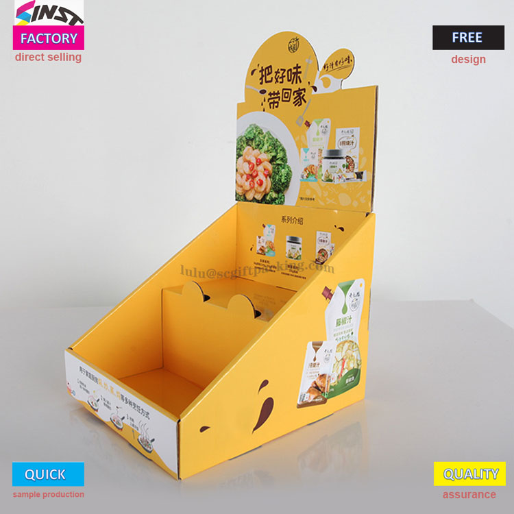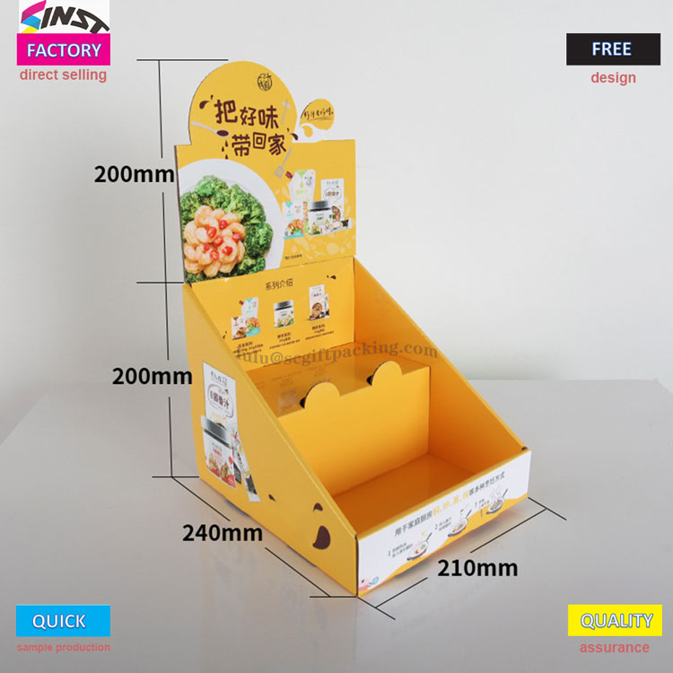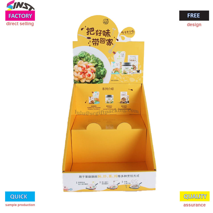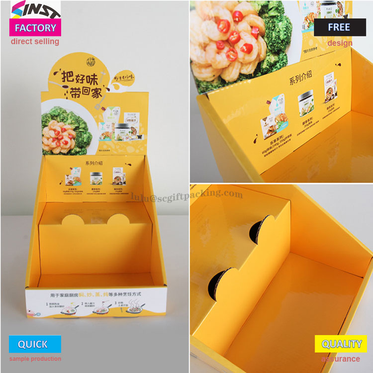 Ez egy szupermarket fűszeres munkalapú karton kijelződoboz, amely lehet egy bors kijelző doboz, só kijelző doboz, csirke esszencia kijelző doboz stb. Elsősorban élénk sárga színű, és szemet gyönyörködtető eszközévé vált a munkalap kijelzőjéhez!