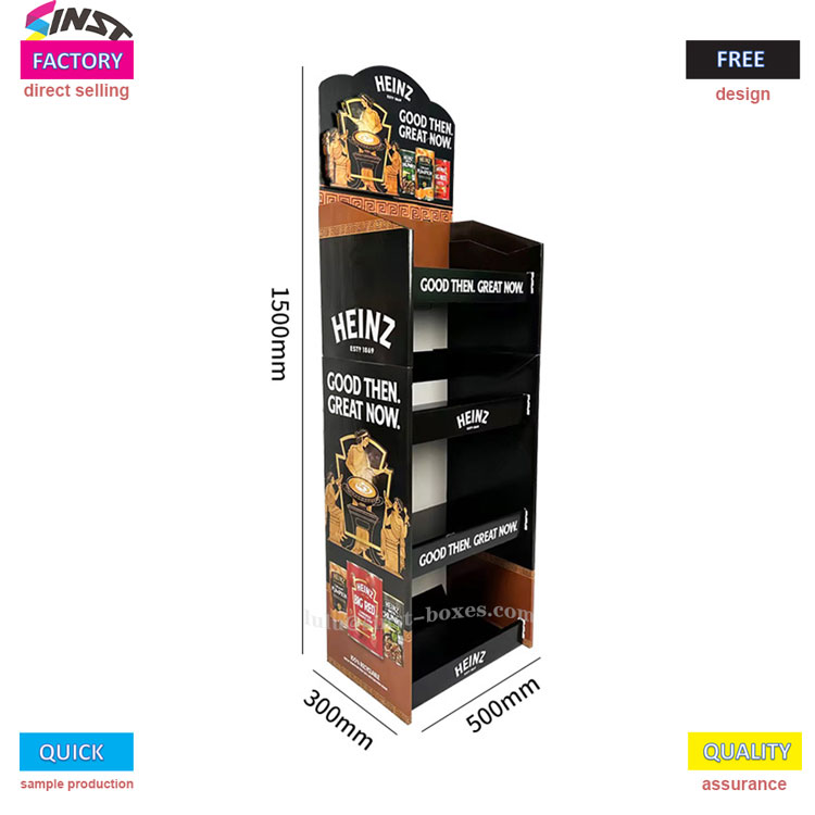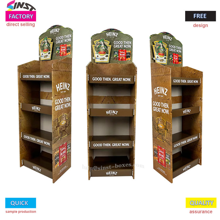 A paradicsomszószos karton állvány az "erős márkamegjelenítés + praktikus megjelenítés" köré épül, kifejezetten paradicsomszószhoz tervezve, és alkalmas kiskereskedelmi helyszínekre, például szupermarketekre és kisboltokra. A paradicsomszósz-kijelző állvány négy rétegű tárolóhelyet biztosít a különböző specifikációjú paradicsomszószok réteges elhelyezéséhez. A szabványos palackoktól a kiscsomagolású próbatermékekig zökkenőmentesen és elakadásmentesen "helyezhetők a megfelelő pozícióba".