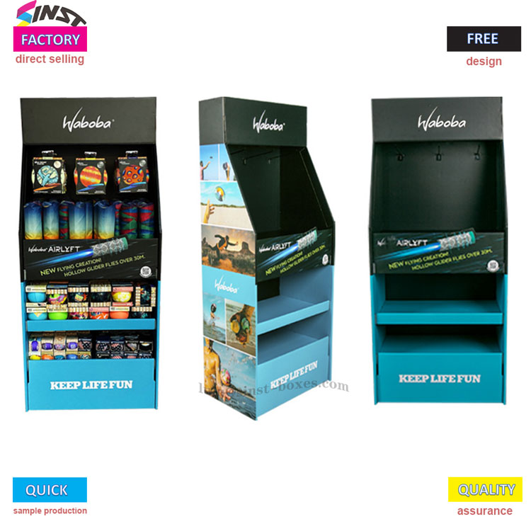 A gyermekjáték-bemutató állvány alapteste kék-zöld, karakterjáték-jelenetek illusztrációival, az alján található „KEEP LIFE FUN” szlogen pedig a „szórakozás” alapfogalmát közvetíti. A nyitott réteges kialakítással a gyerekeket azonnal vonzza a jelenet, és könnyedén rajzolhatnak és próbálhatnak ki vitorlázórepülőket és frizbit; A szülők könnyen felismerhetik, hogy „ez a játék boldogságot hozhat” a szlogenek elolvasásával és a márkák azonosításával.